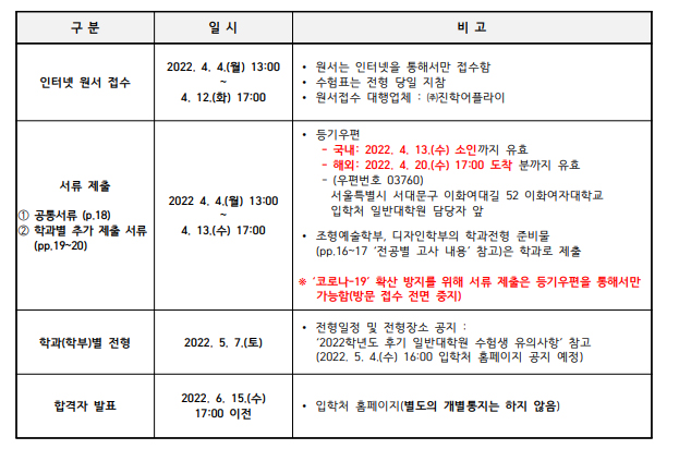 2022년 이화여자대학교 후기 일반대학원 입학전형을 아래와 같은 일정으로 실시할 예정입니다.
